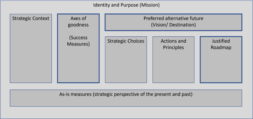 • Strategy as Identity (Who is us?): This is a vital section that is very often missing (or at best latent or assumed) but is one of the key strategic questions.